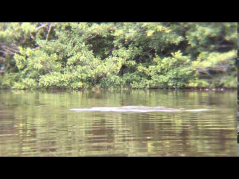 We got our canoe loaded up and we were off. With no one else but ourselves, our guides, and the jungle. Upon paddling downstream, the air ringed with calls of all different kinds of birds much to Roberta's pleasure. The first part of the river was within the banks and flowing at a fair clip which tired us out on the return. The first animal José spotted for us on the river edge was a young anaconda soaking up the sun.